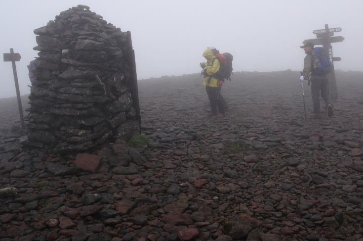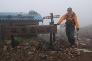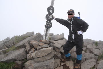硫黄岳山頂 (2,760m) (AM11:10) とうとう硫黄岳山頂に立つことができたが山頂付近では猛烈な風が吹き荒れ、横殴りの雨まで降り出してきてしまった。 手袋がなければ指先が凍えるし、一枚着込んで雨具を着用しなければ体温が奪われるほどの寒さだった。 耳たぶが寒さのために痛い。 体感温度は氷点下だろうと思う。 先日の北海道での痛ましい遭難事故が思い出された。 とにかくじっと立っていることができない。身体が吹き飛ばされそうだ。 姿勢を低くして進行方向の右側から吹く風向きの方に体重をかけながら次の目的地である横岳を目指した。 楽しみにしていた硫黄岳の爆裂火口はガスっていて全く見ることができずとても残念だ。 |