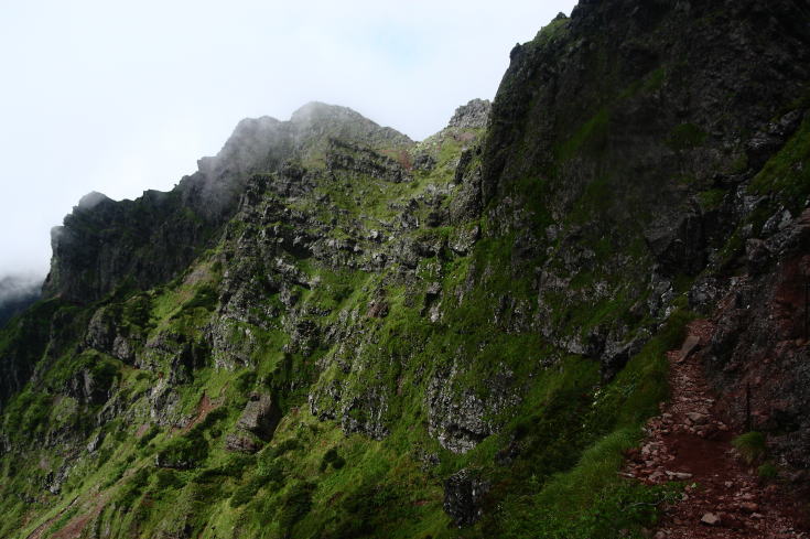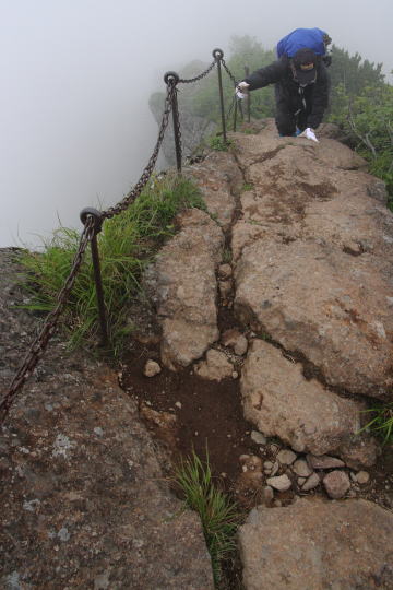 | すれ違った方々が足元の切れ落ちた鎖場を行く。 見ている方がハラハラしてしまうのはなぜだろう。 |