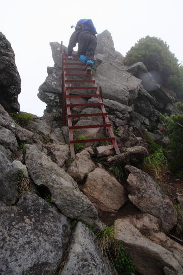 横岳山頂付近の岩稜地帯は鎖場とはしごの連続だ。 雨に濡れた岩場とはしごは要注意だ。 |