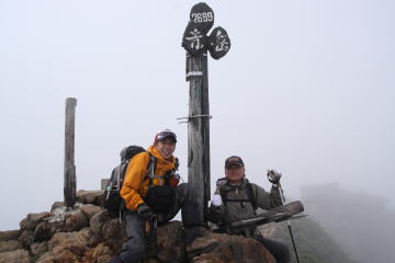 赤岳山頂 (PM3:55) かなりペースダウンしてしまっている。 この頃になるとこのままでは明るいうちに下山するのは難しいかもしれないと思うようになっていた。 のりあきちゃんの膝は悲鳴をあげてすでに限界に達していたのだ。 それでも赤岳の頂に立てた喜びを二人で分かち合った。 |