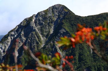 真っ赤に色づいたナナカマドの実と三鈷峰 |