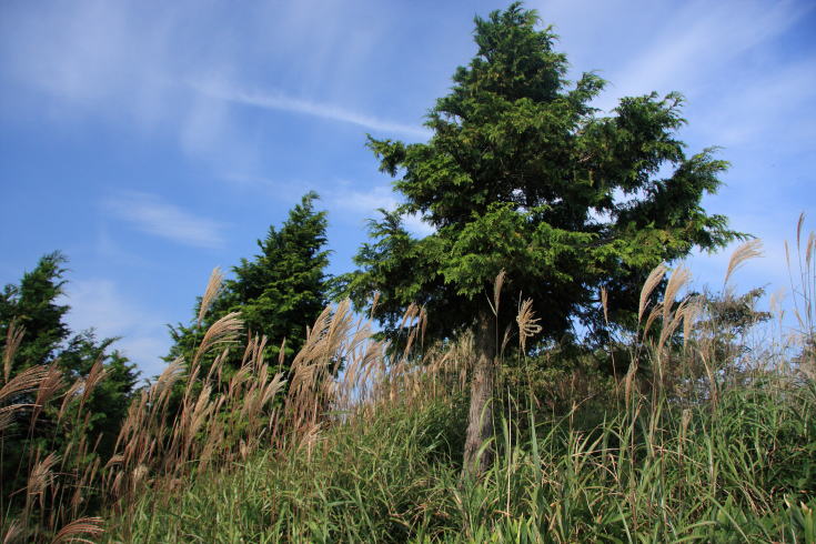 まもなく登山道は急傾斜の直登に変わり潅木の軽いヤブ漕ぎとなる。 徐々にクマザサとススキのヤブ漕ぎに変わり背丈を越える高さになってきた。 これほどのヤブ漕ぎになっているとは思っていなかったので半袖の服装を少々後悔する。