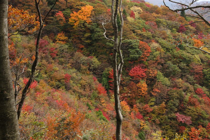 山々が織りなす紅葉に何度も立ち止まってはシャッターを切っていた。 |