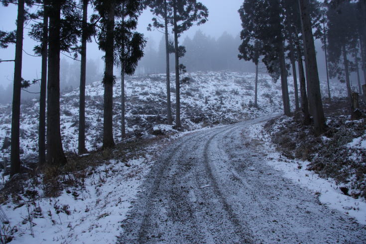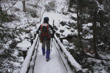 | 林道にはうっすらと雪が残っている程度で、期待していたほどの積雪ではなかった。 (AM9:05) 今回もスノーシューはお預けとなった。 |