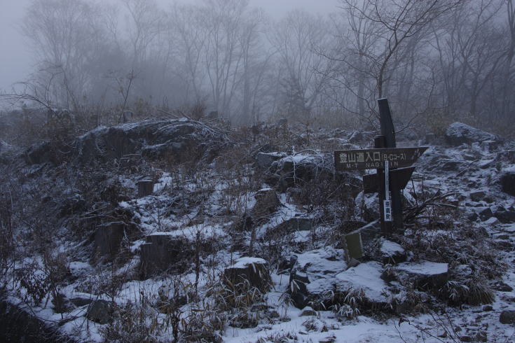 | B、Cコース登山口 天気がすっきりしないうえガスっている。 こんな天気だと、数年前の台風でなぎ倒された無数の倒木の切り株がいっそう痛々しく感じてしまう。 |
