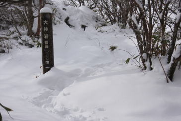 | 大神岩周辺の積雪は30cm程度だろうか。 岩の上に立ってみたが眺望は全く得られなかった。 |