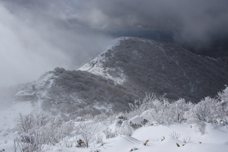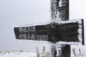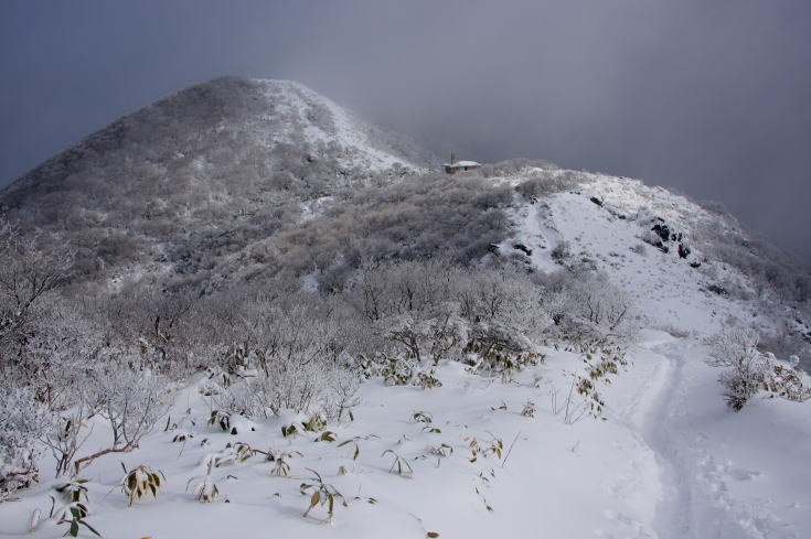 | 避難小屋が見えてきた。 小屋では3名の方が食事をされているところだった。 私も仲間に入れてもらい、楽しいひとときを過ごすことができた。 初日の出を見るために避難小屋で宿泊された方が先ほどまでいらっしゃったようだ。 残念ながら初日の出を拝むことはできなかったと言うことだ。 |
