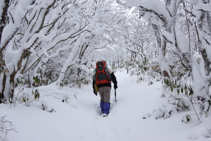 | 避難小屋でご一緒させていただいた岡山市の方とBコースを行く。 積雪は50〜60cmだろうか。こちらのコースの方が積雪が多いようだ。 フカフカの雪の上を歩くのは本当に気持ちがいい。 |