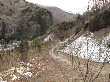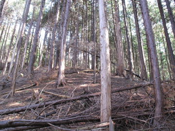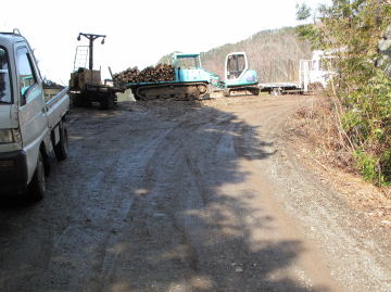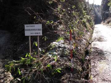 | 林道の入り口には「新林業構造改善事業金井谷線起点」の看板が立っている。 この看板を左折し未舗装の林道に入るが路面の凹凸がひどく、時おり車の腹をこすってしまった。 おまけに道路はぬかるみ車は泥だらけだ。 結局約100m進んだところで車をあきらめて歩くことした。 こんなことなら県道沿いに駐車しておけばよかった。 身支度をしていると立木の伐採をしているという方から声をかけられた。 霰ヶ山を歩くのだと言うと、親切にもだいたいの登山ルートを教えてくださった。 しかし、どうも「岡山の山百選」のルートとは違うようだ。 林道の入り口から約400mのところで木材の積み込み作業が行われていた。 林道はさらに続くが、ここから約50m程進むと林道と分岐して作道が右手に伸びている。 教えられた通りこの作業道に入る。 200m〜300m行くと作業道はさらにふた手に分岐しているが、この分岐を左に進み高度を上げて行く。 |
