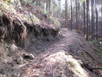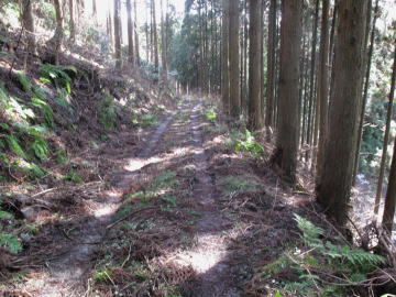 | 尾根を外さないように急傾斜をひたすら登ると西尾根の小ピークに辿り着いた。 この尾根には明瞭な踏み跡がありこれを辿る。 やがて目の前に尾根を分断する林道が現れたので驚いた。 |