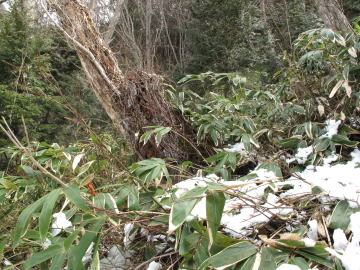 | 一旦林道に出て尾根に取り付けそうな場所を探しながら歩く。 300m程進むと右手の低木の枝に赤いリボンを発見。 ここから再び尾根に取り付くが熊笹のヤブ漕ぎがしばらく続く。 |