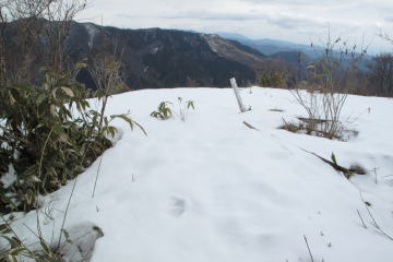 | 残雪の尾根を行く。 | 歩き始めて1時間45分、ようやく山頂に辿り着いた。 雪に埋もれていた山頂の標識を掘り起こし 二等三角点の後に立てかけてパチリ。 |