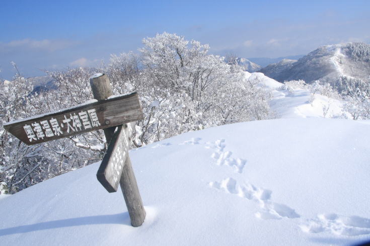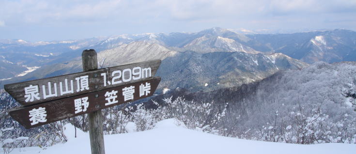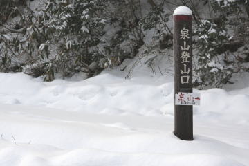 鏡野町の広域農道から見える泉山の山頂部は雪に覆われていた。 先日の寒波の影響で山頂付近はかなりの積雪だろう。 国道179号線を北上し「道の駅奥津温泉」を左手に見送り、次の交差点を右折して奥津ゴルフ倶楽部方面に進む。 積雪期、この基幹林道はゴルフ場の少し先までしか除雪されていないことが多いのだが、 幸い大神宮原コース入り口までしっかり除雪されていた。 |