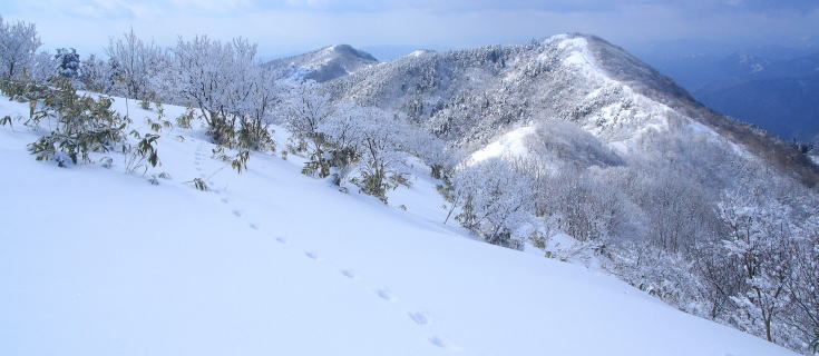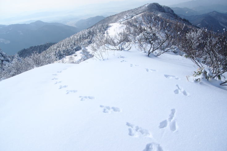 縦横無尽に駆け回った野うさぎの愛らしい足跡に励まされながら積雪の登山道を進む。 やがて標高1,000m近くになるとトレースはなくなり、積雪も増して膝上まで潜り出した。 ツボ足では厳しい状態になってきたところでスノーシューを装着。 やはり歩きやすい! 中央峰山頂直下の急斜面では積雪がさらに増してロープなしでは登れない状態になった。