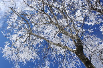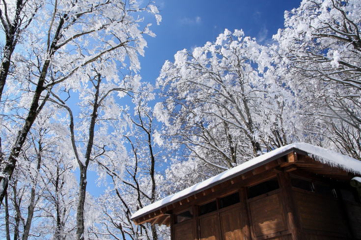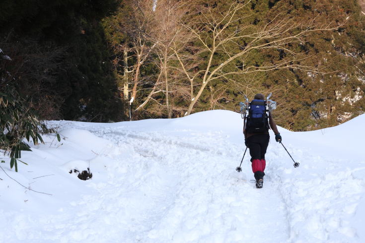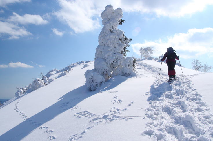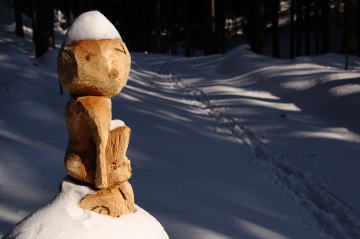 途中真新しいチェーンソー・アートの奇妙な彫刻が出迎えてくれた。 河童のようであり、お地蔵さまのようでもある。 数体のアートはどれも切り株の上に膝を立てて座っていた。 林道をさらに進むと徐々に積雪が増し、ツボ足で歩きにくくなったところでスノーシューを装着。 トレースはその先で突然消えてしまった。 どうやら途中で引き返されたようだ。 1時間以上かけてようやく金ヶ谷山登山口に到着。 いよいよここから急登が始まる。 見上げれば真っ青な空が広がっている。 気温が上昇する前に山頂付近まで登れたらすばらしい樹氷の風景に出会えるかもしれない。 |