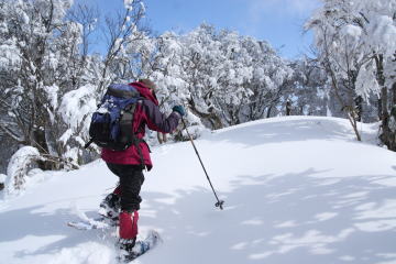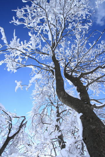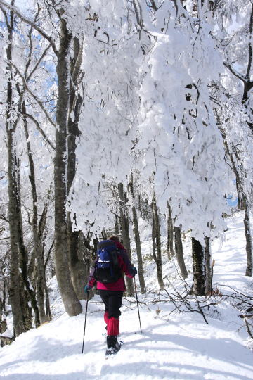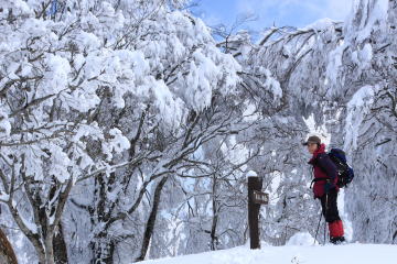 着氷して大きくしなだれたブナの枝 アップダウンを繰り返しながら続く縦走路では重い雪に悩まされ、たびたび立ち止まっては呼吸を整える。 段々足取りが重くなってきたが、Nさんは平然と私の後に続いている。 |