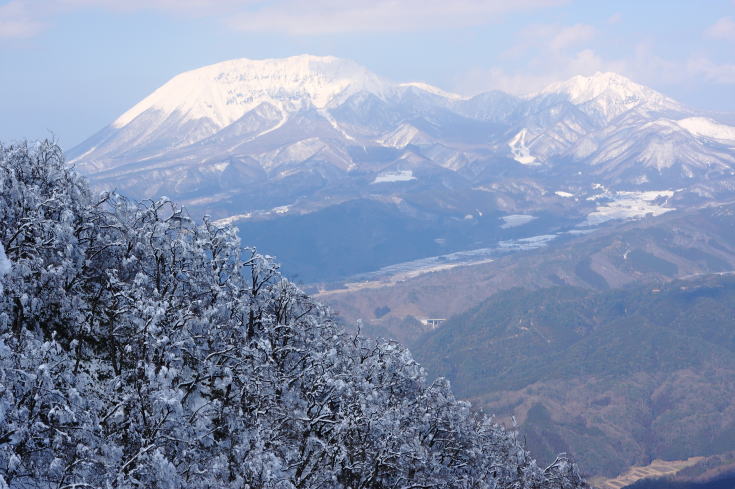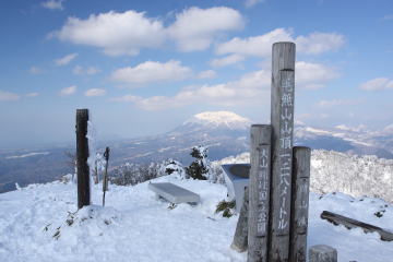 毛無山方面への分岐が近くなるとブナの木に積もった湿雪が凍りつき、どの枝も大きく垂れ下がっている。 登山道の至るところに折れた枝が痛々しく横たわっていた。 すばらしい樹氷に出会えるのではないかと期待していたのに、思わぬ光景を目の当たりにすることになった。 金ヶ谷山山頂付近から望む大山は雲に覆われている。 ここでゆっくり昼食を楽しんだあと白馬山に向かって再び歩き始めた。 (11:05) |