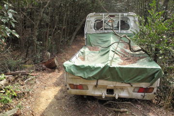 狭い登山道に軽トラが突如現れた。 これを見たらホント驚きますよ! それにしてもどうやって下ってきたんだろう。 |