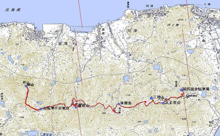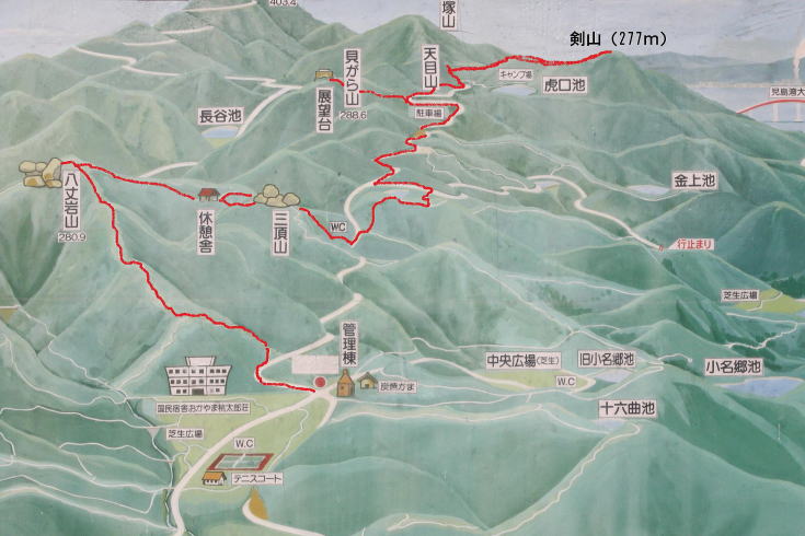今回は児島半島の東部に位置し、児島湾や瀬戸内海が一望できるという貝殻山に向かったが、 この山を往復するだけではつまらないので八丈岩山、三頂山、貝殻山、天目山、剣山をピークハントしながら歩いてみることにした。 |