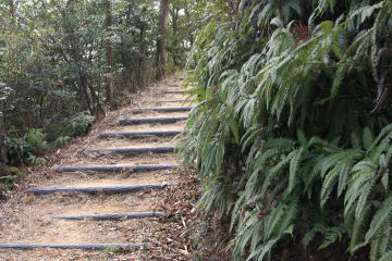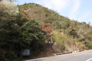 八丈岩山遊歩道はやがて終点を迎え車道に出合う。 貝殻山へはこの車道を歩かなければならないようだが、地形図を確認すると車道を少し進んだ右側に遊歩道が伸びているようだ。 遊歩道は車道を100mほど進んだところから始まる。 この遊歩道は再び車道に戻るだけで遠回りになるだけなのだが、 アスファルトの道を2km以上も歩く気にはなれず、遊歩道を歩くことにする。 |