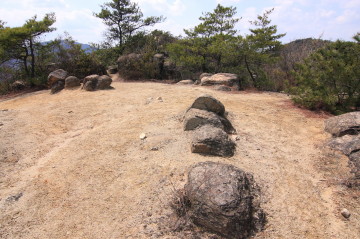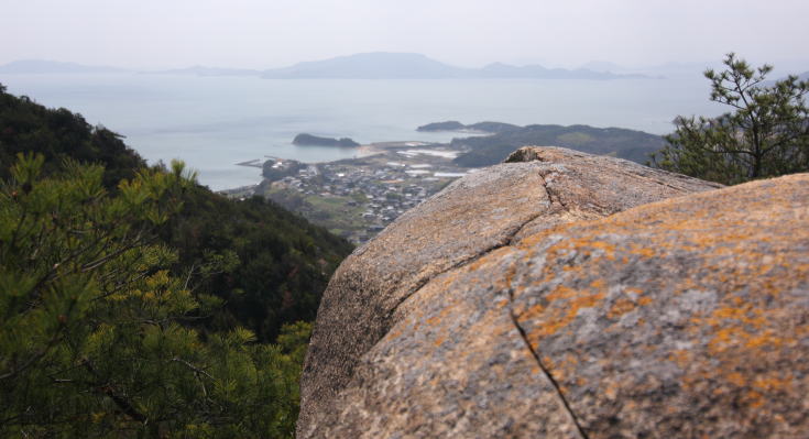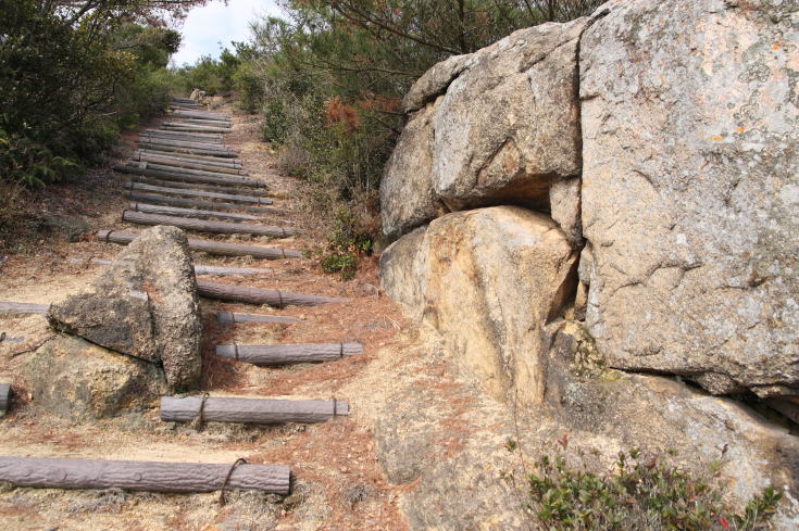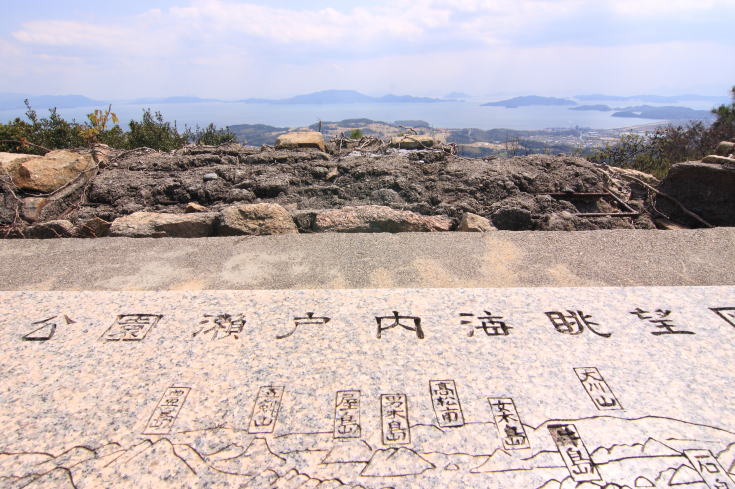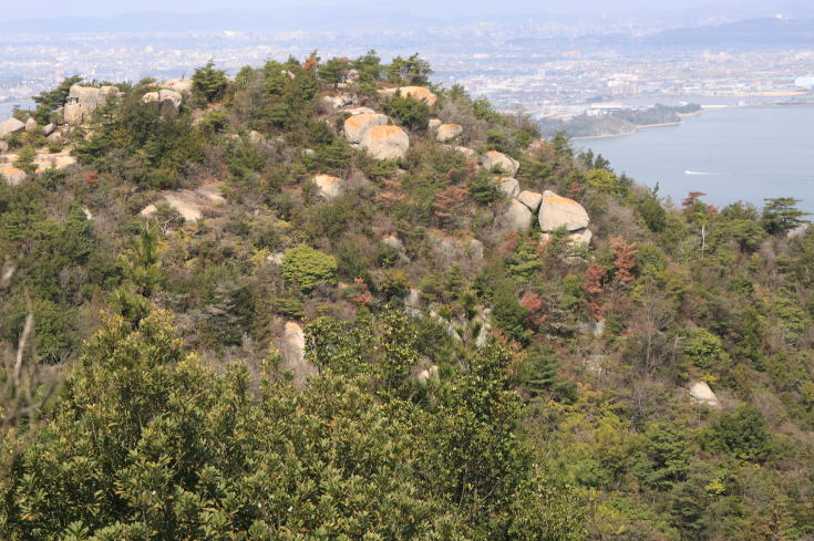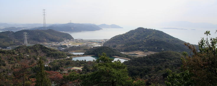 よく整備された遊歩道の両脇には背丈の低い松の木が配されているが展望の邪魔をすることはなく、 高度を上げて振り返れば瀬戸内海の景色がすばらしい。 |