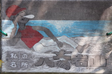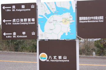 何度も絶景を振り返りながら、そして見ごろを迎えたツツジにも励まされて八丈岩山山頂(281m)に辿り着いた。 広々とした山頂には一等三角点がありベンチも用意されている。 樹木に囲まれて展望はないが、わずかに歩を進めた大岩に立つとすばらしい景色が広がっていた。 表示板の絵のようにここで昼寝を決め込むのもいいかもしれない。 さて、次に目指すは三頂山だ。ふたたび八丈大岩の山頂に戻り西に伸びる遊歩道を進む。 |