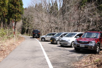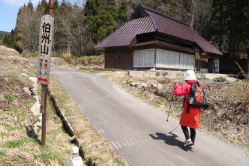 そろそろイワウチワが咲きはじめているのではないかと家内を誘って伯州山を訪ねてみました。 いつもの駐車スペースはすでに満車。 さらに奥へ奥へと進むが至るところに車が駐車されていて車を停める場所はどこにもなかった。 仕方なくUターンして戻りかけたところ、登山を終えた一台の車がやっと駐車スペースを与えてくれたのだった。 滝谷コースの入り口となる民家付近にも観光バスが停車している。 静かな山歩きを期待していたが今日はそうもいかないようだ。 |