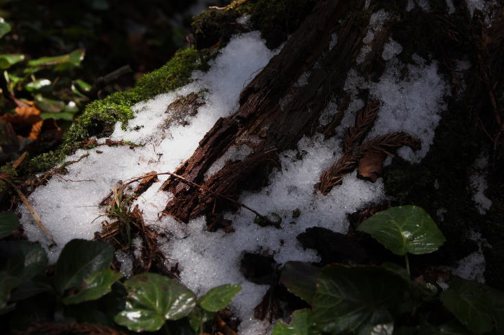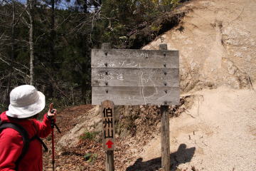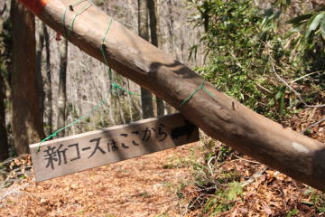 春の日差しが降り注いでいるものの山頂を吹き抜ける風はとても冷たかった。 展望は申し分ない。 ただ、残念なのは大山が霞んでいて西の方角にぼんやりと浮かんでいたことだ。 暖かいカップ麺を頂いたあと、誰もいなくなった山頂で地図を広げてあれは○○山、 そしてその山は○○山などと家内に説明するが、あまり興味がないようでどこかうわの空である。 下山は従来の滝谷コースを下った。 こちらのコースは日当たりの悪い場所ではまだ雪がかなり残っている。 雪解けでぬかるんだ登山道でときどき尻もちをつきそうになりながらゆっくり山を下っていった。 |