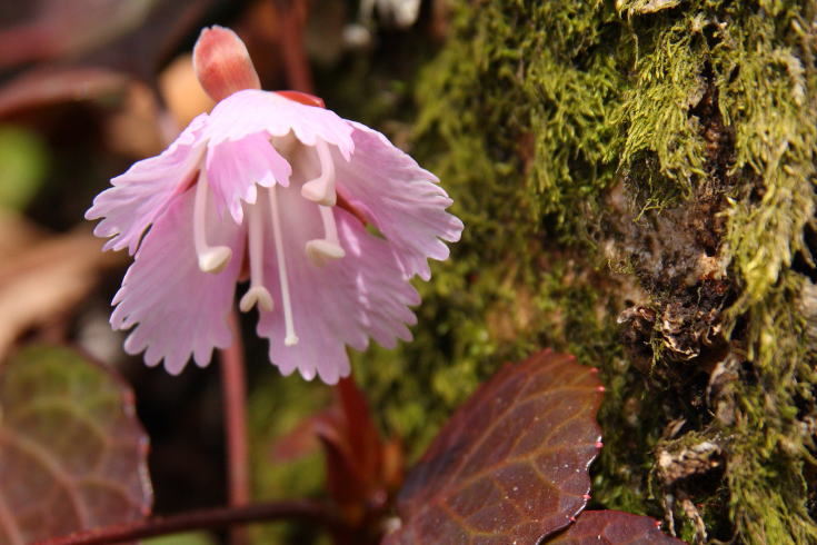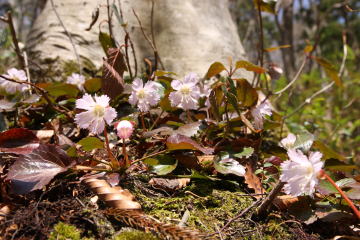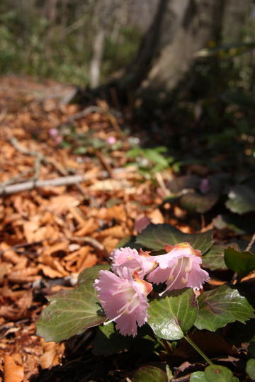 やがて未舗装の作業道が終点を迎えたところで山道が二つに分岐している。 右側に続く登山道をわずかに進んだところで立ち止まった。 ブナの木の周りに可憐なイワウチワが咲き始めている。 |