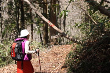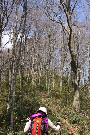 山道の階段の脇に咲いたイワウチワを鑑賞しながらゆっくり高度を上げてゆく。 コース途中からは昨年も利用した新コースに進み尾根に取り付く。 |