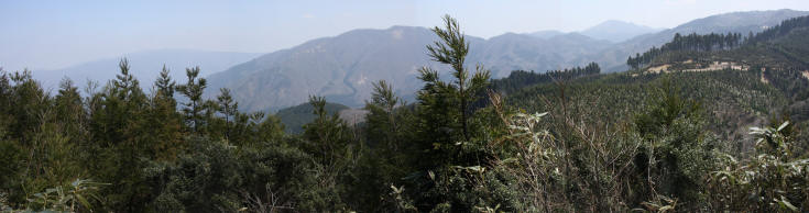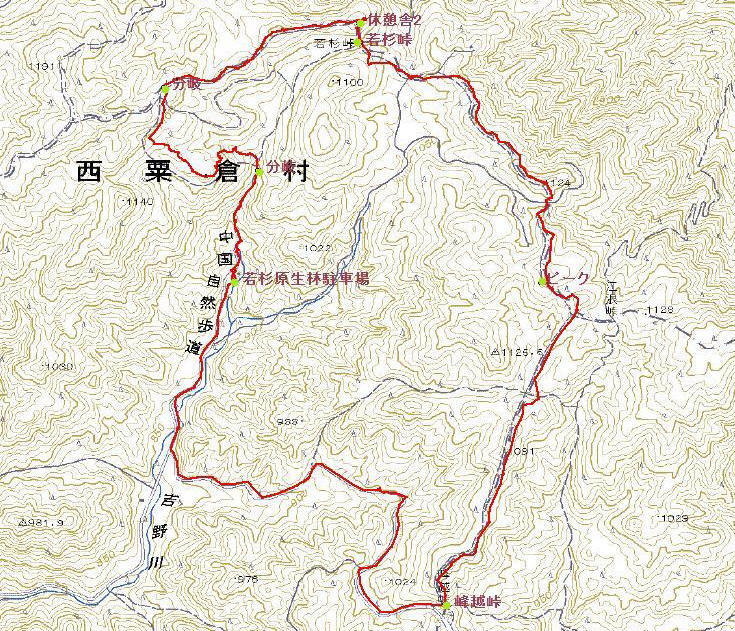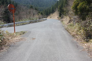 そして二つのピークを超えてしばらく行くと峰越峠に飛び出した。 ここから車道を約2.8km歩くと若杉原生林の駐車場に帰着した。(PM2:05) (歩行距離 約9.2km) |