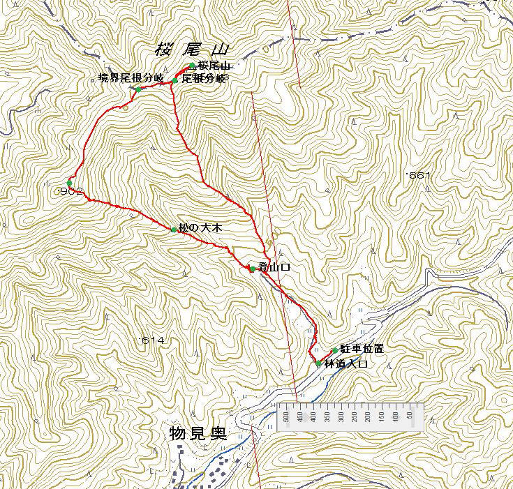 | 国道53号線から県道6号線を経由し、物見奥の集落を過ぎると道路は大きく左にカーブする。 さらに右カーブを過ぎて約350mの地点に林道の入口がある。 今回はこの林道を起点に登山道のない桜尾山を歩いてみたい。 AM8:51 林道入口を過ぎて車道が広くなった場所に車を駐車して歩き始めた。 |