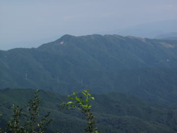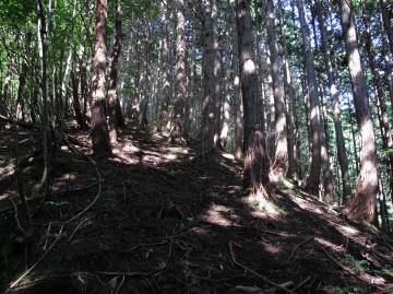 展望がきかないので鉄塔によじ登ってはみたものの、6〜7m上るのがやっとだった。 下山は往路を100mほど戻った尾根の分岐に明瞭な踏み跡があるのでこれを下ることにする。 予想外にも、ヤブ漕ぎすることもなく植林帯の中をどんどん下って行けるので、 わずか30分であっけなく林道の脇に辿り着いてしまった。 (AM11:45) このルートを辿れば難なく山頂に立つことができるだろう。 |