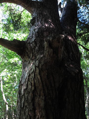 二股の松の大木 (AM9:27) 直登する尾根は次第に傾斜がきつくなり息が上がりはじめた頃、目の前に松の大木が現れた。 松の大木を過ぎると尾根は膝上程度の笹漕ぎに変わり、AM10:06 ようやく902mピークの北東50m辺りの境界尾根に飛び出した。 ここで再びコンパスをセットし直して尾根を外さないように山頂を目指すが、すぐにヒノキの倒木に行く手を阻まれることになる。 おびただしい数の倒木である。 積み重なった倒木の上をバランスを取りながら超えて行かなければならない。 倒木帯を過ぎるとヒノキの樹林帯になりずいぶん歩きやすくなる。 しかし、境界尾根分岐地点が近くなると再び背丈以上の熊笹と潅木のヤブ漕ぎとなる。 下山時にこの分岐で迷わないように念入りに目印を付けてゆく。 902mピーク手前の境界尾根に飛び出して30分が過ぎた頃、突然目の前に銀色に輝く反射板が現れた。 どうやら山頂に辿り着いたようだ。 (AM10:35) |