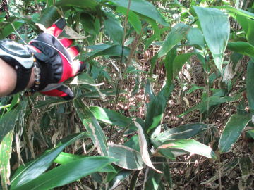 背丈を越えるヤブ漕ぎだが、 ネマガリダケのように苦労することはない。 |