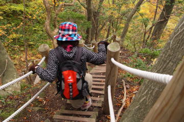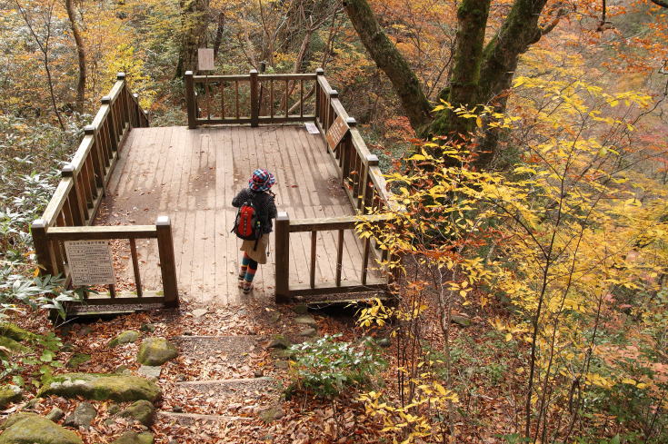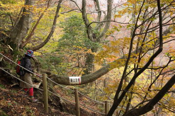 遊歩道を約1km進むとロープの張られた木道の階段を100mほど一気に急降下する。 この辺りの木々もいい感じに色づいています。 |