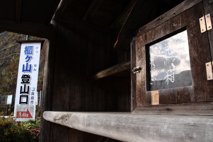 小屋に設置された記帳箱のノートにはたくさんの人たちの山の思い出が綴られている。 登山口の看板を過ぎて200m〜300mほど坂道を上ると民家の脇に案内板が立っている。 登山道はここから始まるが山頂まで各所に案内板が設置されているので初めての人でも迷うことはないだろう。 |