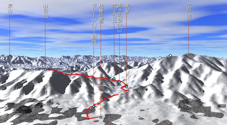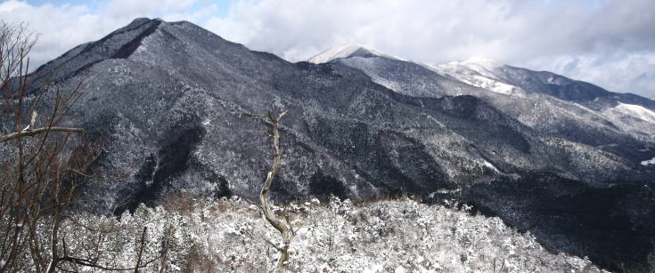 下山を開始頃になると雪雲がスーッと抜けて積雪の那岐三座が目の前に現れた。 PM3:04 駐車位置に帰着 (今回の歩行距離約9.3km) |