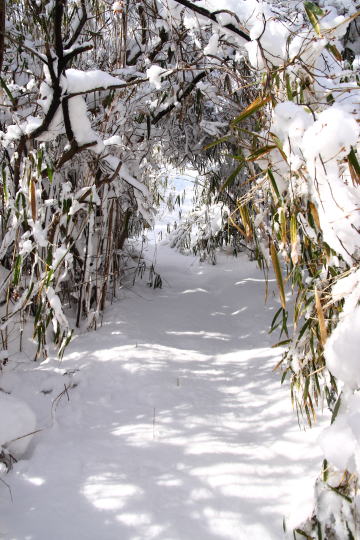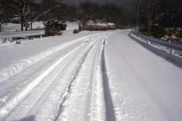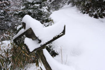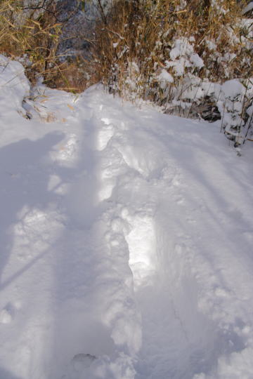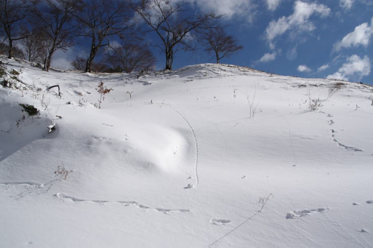 予想以上の積雪だった。 車高のある四輪駆動車のものと思われるタイヤの跡を辿り登山口のある声ヶ乢を目指して車を走らせたが、 私の車では貸し別荘「グリーンハウス那岐」の看板辺りが限界だった。 仕方なくこの辺りで車を置くスペースを探すが見当たらない。 結局来た道を随分下ることになってしまった。 (AM10:20) タイヤの跡は声ヶ乢の手前にある東屋まで続いていたが、斜面でソリ遊びをした痕跡が残っているだけで車も人影もなかった。 東屋から先はタイヤの跡もトレースもない。 そこにあるのは動物達の足跡だけだった。 |