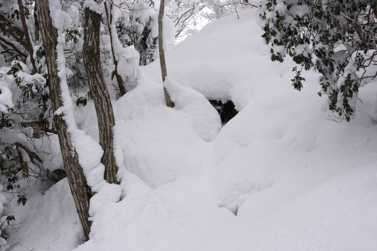 目の前にこんな雪の吹き溜まりが出現した。 おまけに急斜面である。 結局ここは左側に迂回しやり過ごすことにしたが、 スノーシューを履いているのに太ももまで沈み込む一番の難所だった。 |