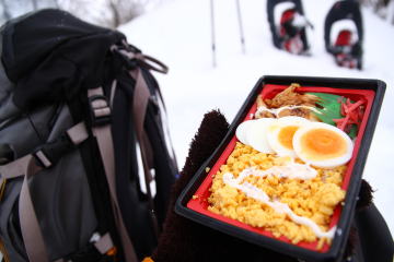 山頂でコンビニ弁当を広げているとやっと青空が広がりはじめてきた。 |