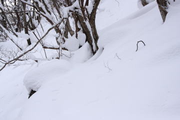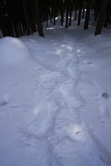 どんどん深くなってゆく積雪。 スノーシューを履いていても膝まで潜ってしまうので、たびたび立ち止まっては息を整える。 |