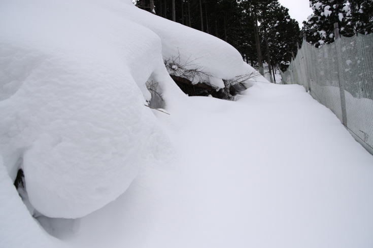 後山を歩くつもりで出かけたが、あまりの積雪に登山口に近寄ることすらできなかつた。 そこで目的地を日名倉山に代えて志引峠に車を走らせた。 |
