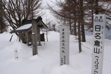 日名倉山山頂 (AM11:45) 山頂は風に飛ばされて大した積雪ではなかった。 |