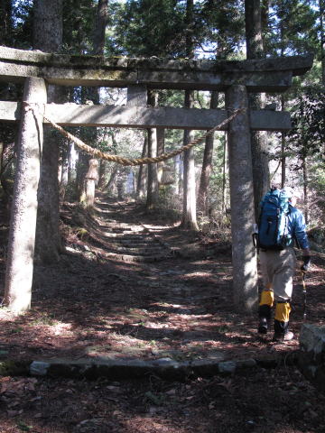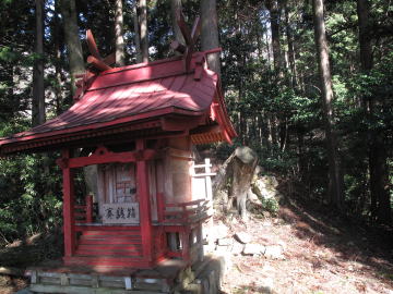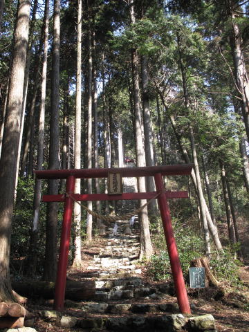 赤い鳥居をくぐり急な石段を登る。 |