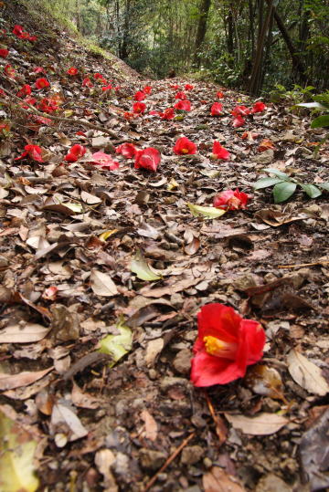 山頂からお堂まで戻り、お堂の前を通って八塔寺山の北側斜面を下る。 途中、登山道に落下した真っ赤なツバキの花に何度も立ち止まった。 |