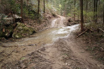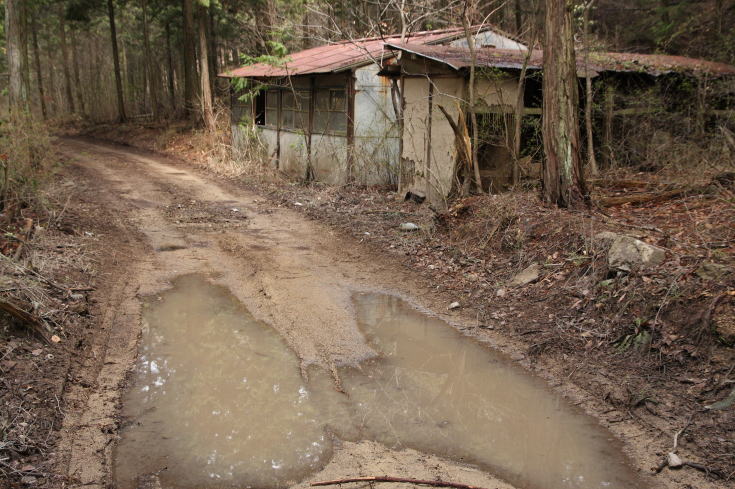 前日に降った雨で林道はご覧の通り… やがてプレハブの廃屋が現れた。 (AM9:21) |