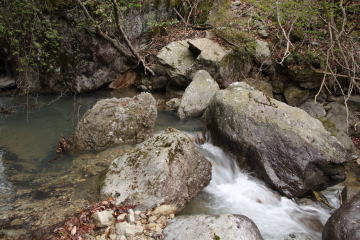 何度も渡渉を繰り返すと右岸から林道が始まっていた。 大きな岩をピョんピョンと飛びながら川を渡った。 この場所はこのコース唯一の危険箇所といってもいいだろう。 |