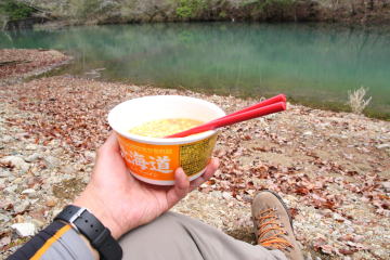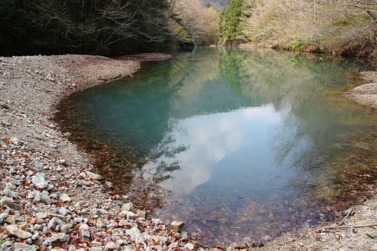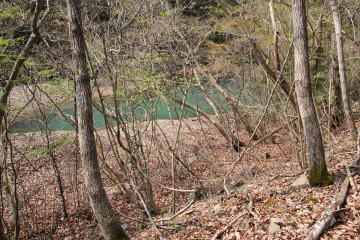 危険箇所を渡り終えてホッとする。 そして林道を15分ほど歩くとコバルトブルーの池が現れた。 |