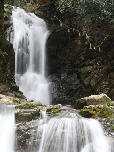 神社のそばに流れ落ちる水量たっぷりの琴弾の滝 |